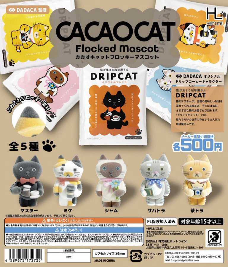 猫が集まる喫茶店「ドリップキャット」のキャラクターが、ほわほわフロッキーマスコットになってカプセルトイに登場しています!